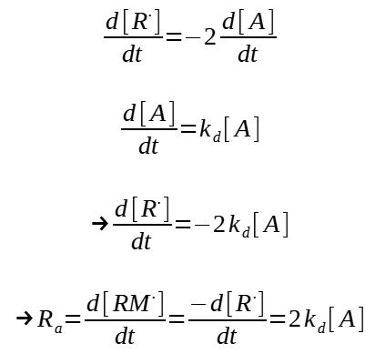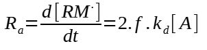 This expression needs however to be modified to take into consideration that only some of the initiator leads to an actual initiation and then a polymerization reaction. Condering f as being the efficiency of the initiatior (f = 0.3 to 0.8), the rate of initiation is then :