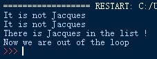 The output will be the following, at the 3rd iteration, we find 'Jacques', thus we leave the loop and 'It is not Jacques' is not printed again.